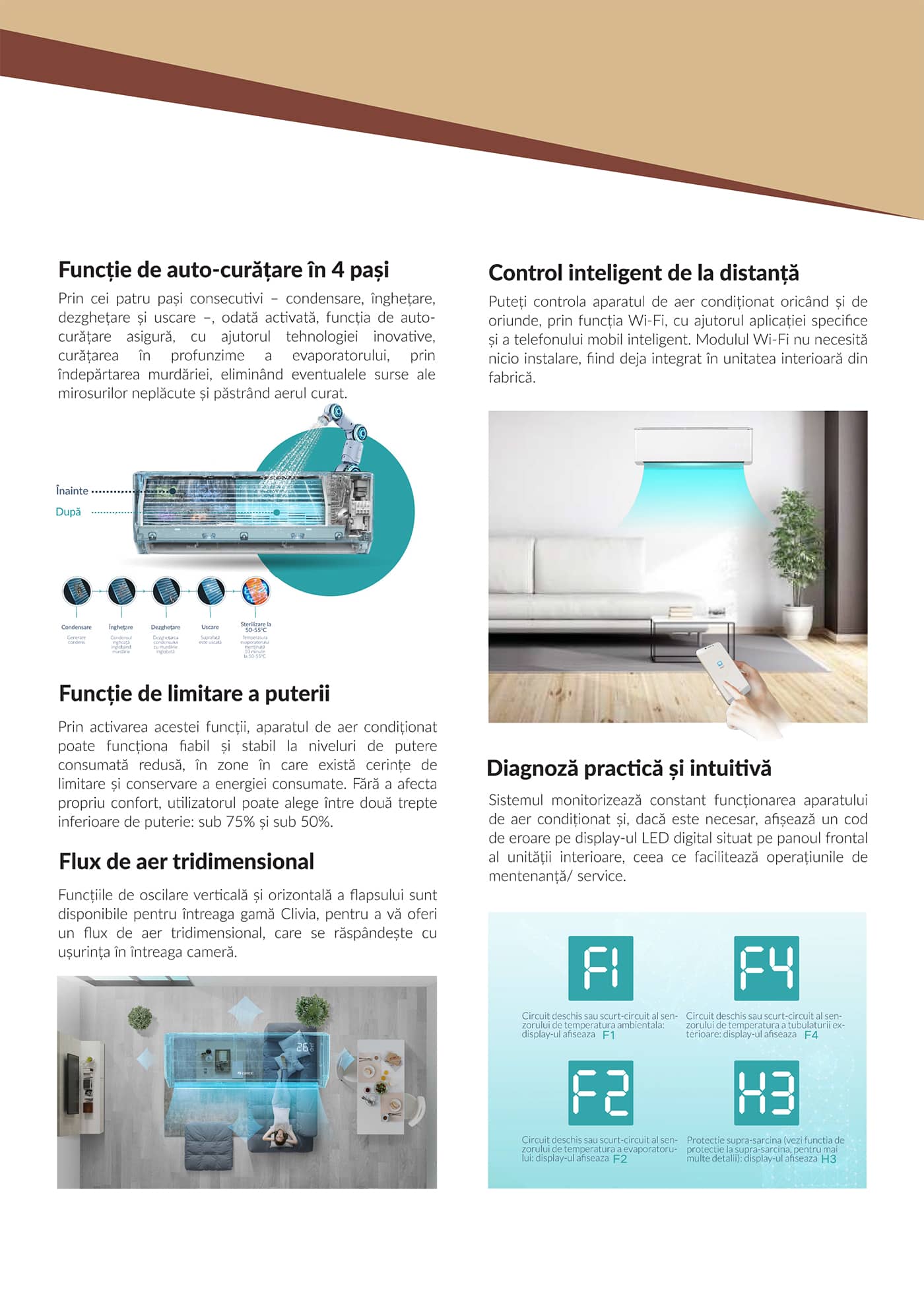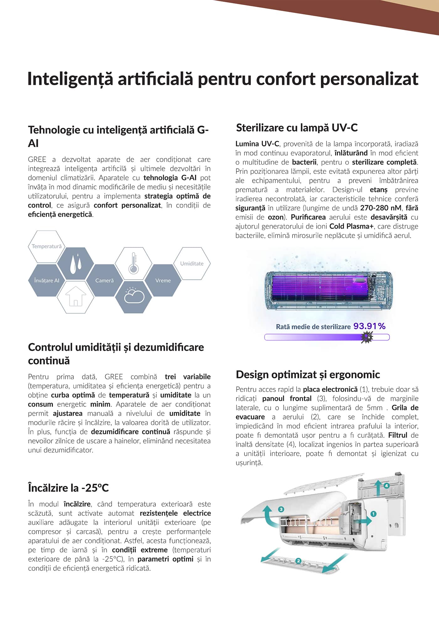 | Functii | Tehnologie cu inteligență artificială G-AI, Autodiagnoza, Autorestart, Blocare, Buton Turbo, Mod Auto, Afisaj LED, Dezghetare Inteligenta, Afisaj ceas, Sleep, Protectie aer rece, Feel, 8 grade C Incalzire , -25 grade C Incalzire, -15 grade C Racire, Flux de aer 3D |